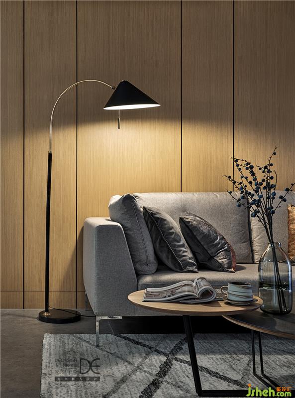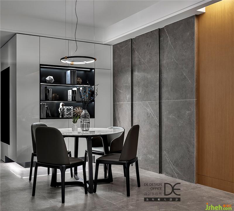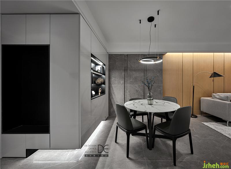 原木饰面板加上灰色柔抛大砖上墙,形成鲜明的冷暖对比。靠墙L型柜体设计增大储物空间,底部镂空设计打破视觉块面,让空间显得更有层次。