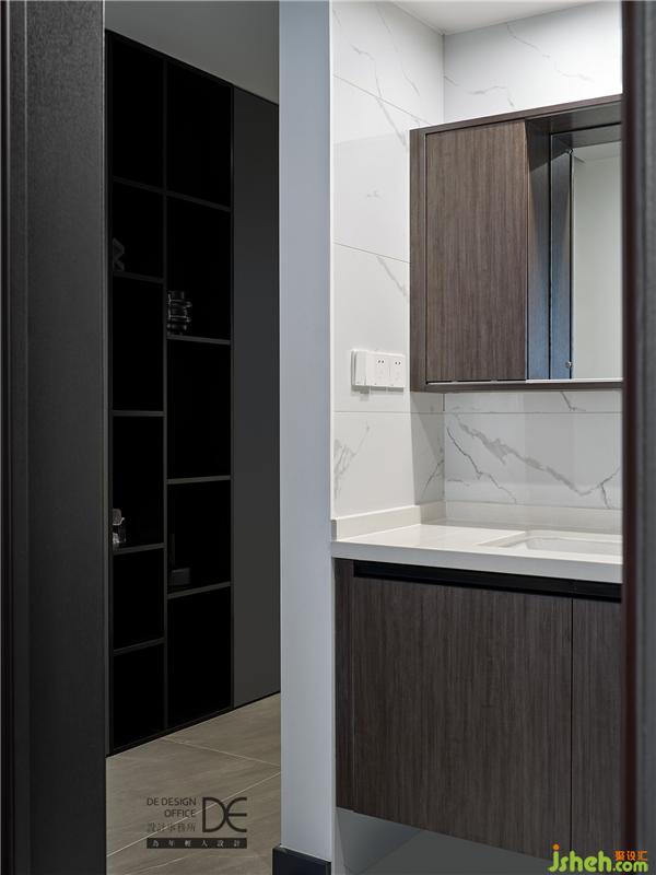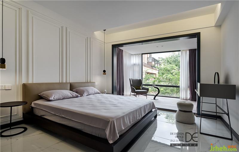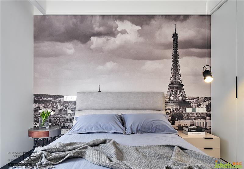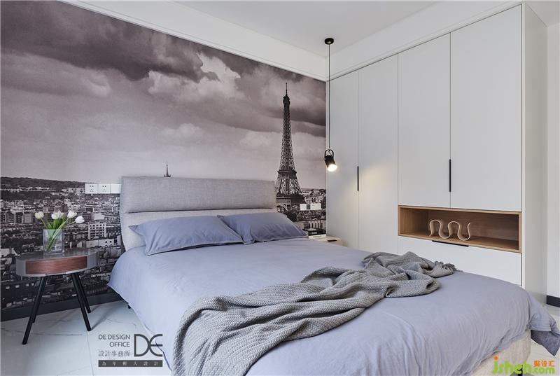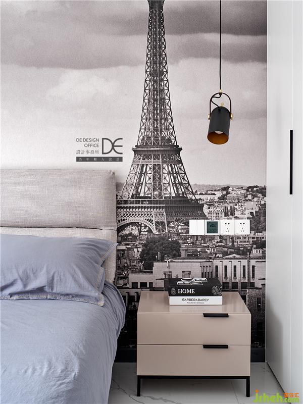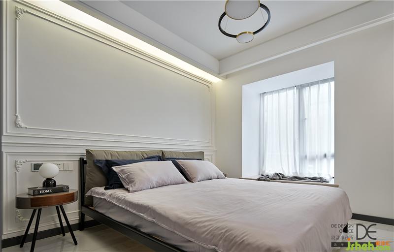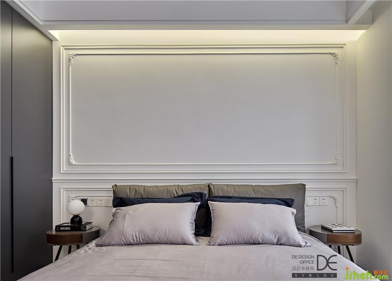 父母房和其他房间一样,黑白灰的主色调,非常干净。床头的线条元素在灯光下更显立体,白色的墙面中则藏有春天的清爽细腻与温柔。