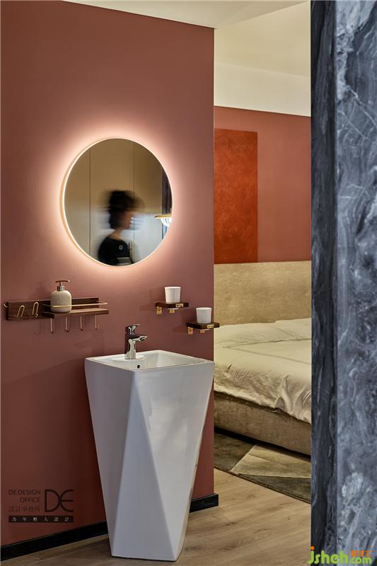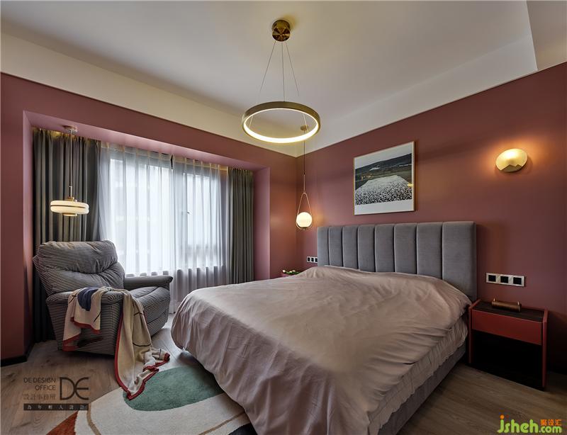 重庆室内设计师把原始的主卧设定为次卧,这样既满足了主卧的套房又让次卧不至于太小。次卧是为父母准备的,但风格没有拘泥于稳重,粉色主调、多组灯光、多色地毯,赋予空间更多格调。