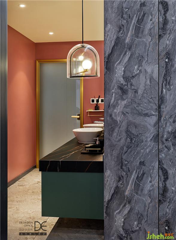次卫设置了独立双盆加操作台的形式,一方面考虑到亲朋好友做客时,次卫比主卫使用频率更高;同时也为后期增加人口做了考虑。主卫及次卫的水龙带选择的是在水中注入空气的产品,以至于干区用水时水不会溅出,使用感更佳。