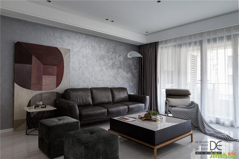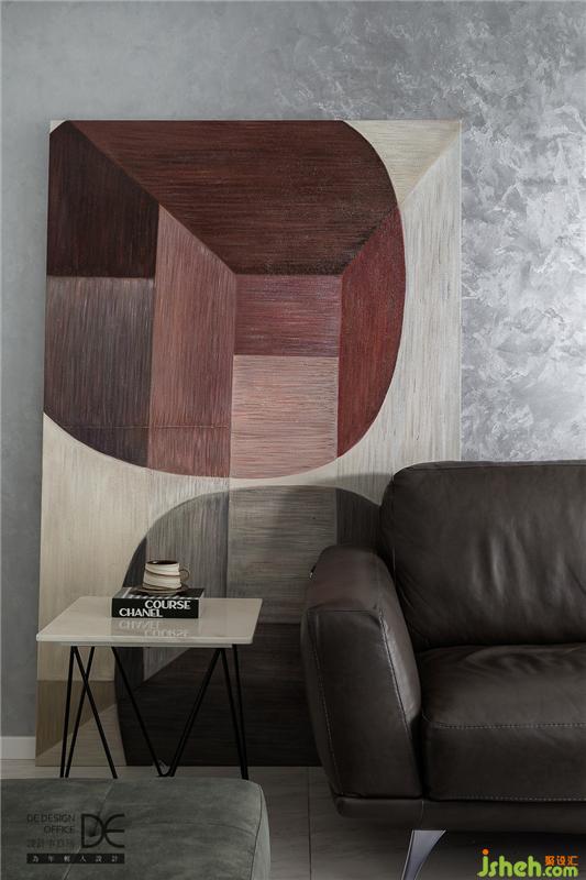 水泥质感的沙发背景墙搭配酒红色抽象油画,设计师将油画放置于墙的偏左边,重庆室内设计师给严肃方正的空间穿插了一丝无序。客厅的颜色、质感和不对称,仿佛在暗示空间也需要一些俏皮。