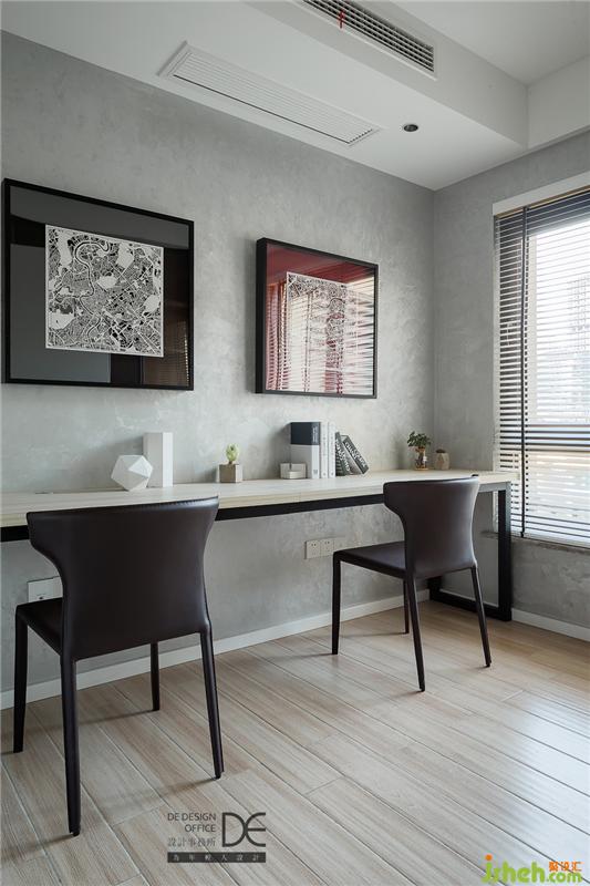 书房设置了实用长桌,与木地板相呼应,给人一种质朴宁静之感。配套的黑红色挂画延续客厅色调,成为点睛之笔。