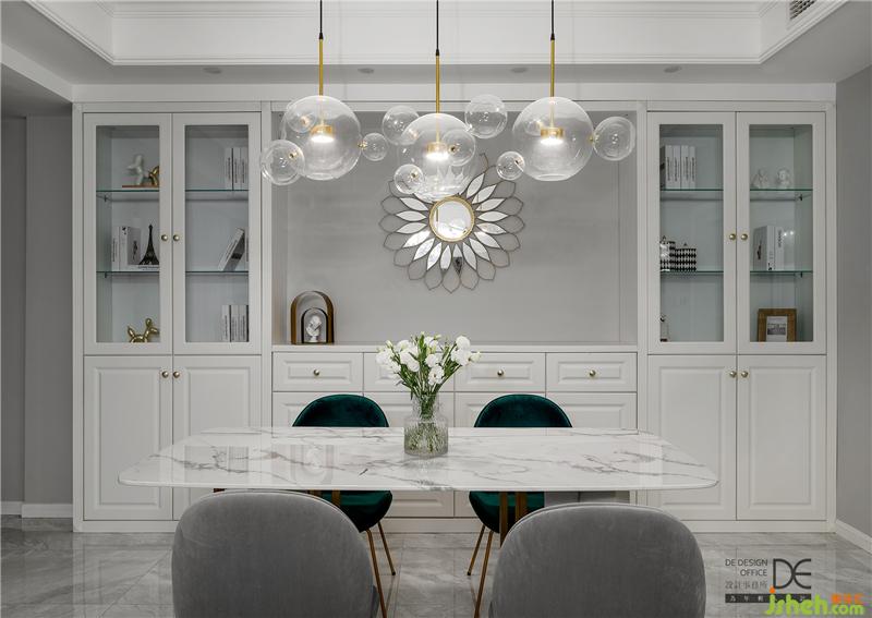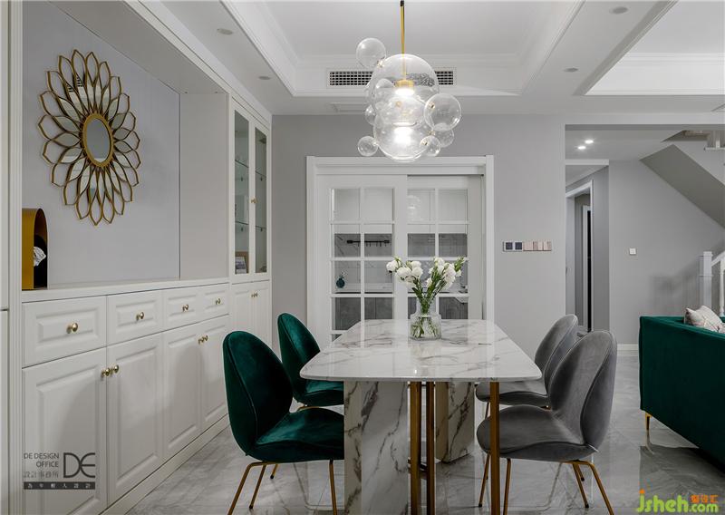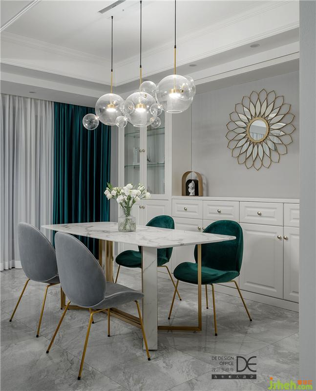 白色顶面搭配灰色大理石地砖,层次分明;壁柜、餐桌、透明灯具均采用白色系,搭配墨绿色桌椅和灰色桌椅,融入部分金属元素,整个餐厅在配色上相互呼应与融合。