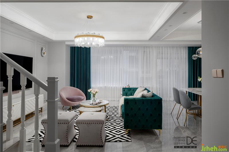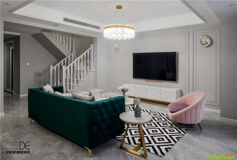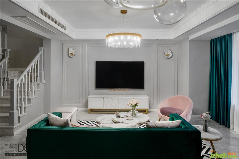 温暖明亮是客厅,简单大气也是客厅。客厅采用边吊搭配造型吊灯,爵士白大理石地面承载着墨绿色和粉色的沙发,电视墙采用造型别致的石膏线条和精致的贝壳壁灯,整个空间线条流畅,张弛有度。