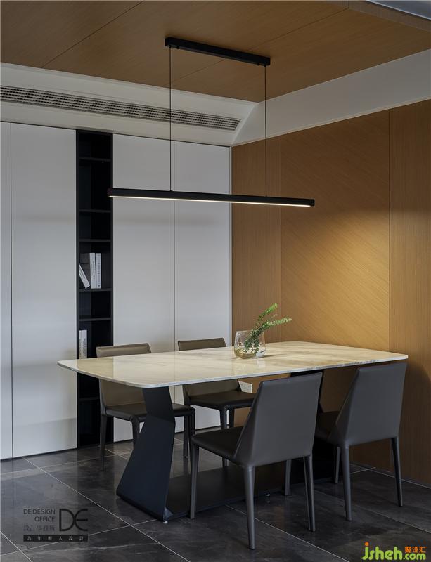 餐厅墙面饰面和顶面相交呼应,让这种延展的感觉直至客厅。餐厅顶面和客厅顶面使用不同的材质,同时间隔处使用漫反射光源,层次感更强。