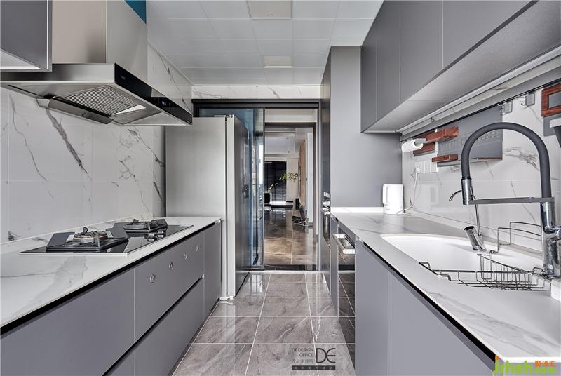 厨房为封闭式厨房,墙面浅色系砖打底,让橱柜材质质感更加凸显。一体式水槽和台面岩板完美贴合,拒绝卫生死角。
