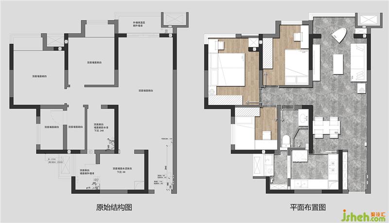 1)在房屋布局上,设计师保留了三房的功能结构,将原始的客厅、阳台滑门做了拆除,释放了客厅的空间,让空间更宽敞通透;