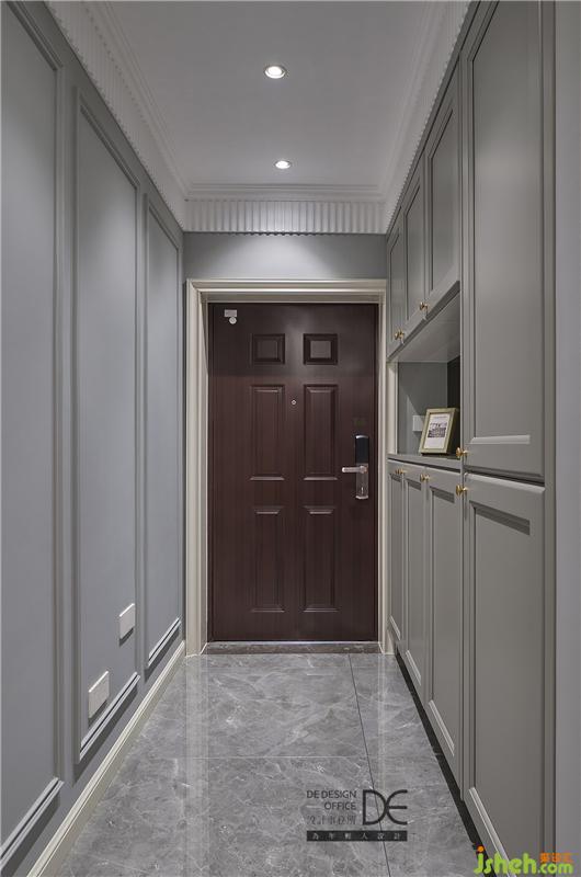 鞋柜选择了和墙面整体非常接近的色系,显得统一协调。中间部分做了镂空,为一些小物件的存放预留了空间,鞋柜下方镂空设计也提高了空间的储物性和生活的便利性。