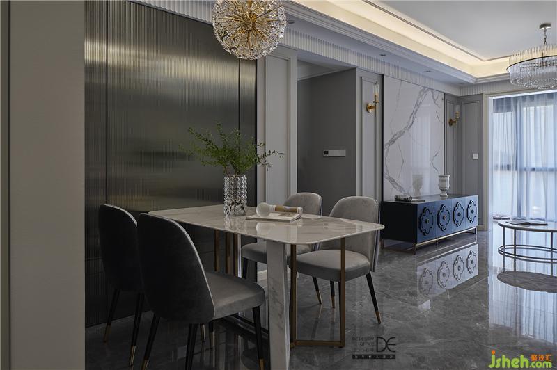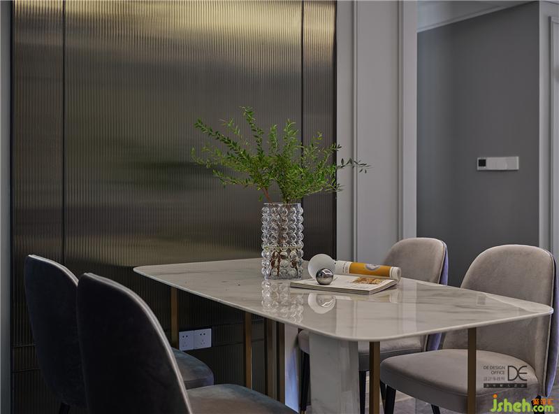餐厅呈现出了整体的轻奢感,金色的线条+长虹玻璃,大理石的餐桌搭配上金色不锈钢腿,散发一种精致的轻奢感。