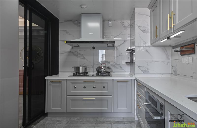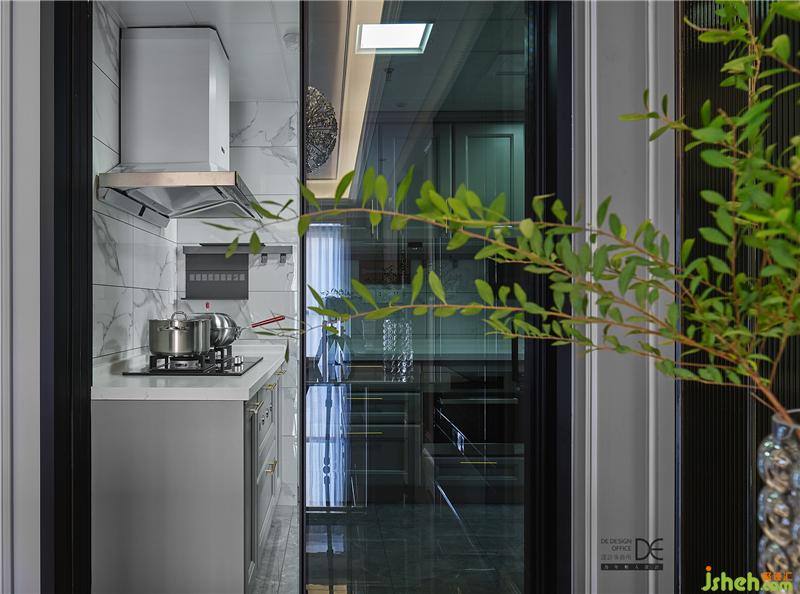 回归生活,采用了传统的封闭式厨房。到顶的大玻璃滑门,既增加了厨房与公共空间的通透感,也不用担心厨房的油烟问题。大理石墙面瓷砖、灰色柜门、金色的拉手,从细节处延展空间的整体调性。
