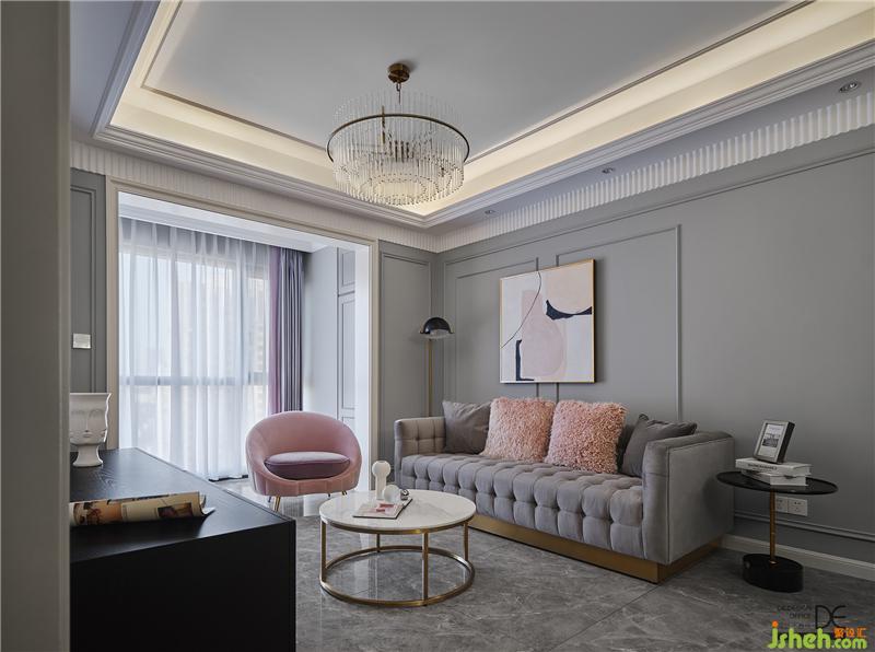 在简约的灰色空间中,金色和脏粉色布艺元素的加入,赋予了空间温度又不失格调。懒人沙发还可以移到阳台,享受好天气带来的惬意与慵懒。
