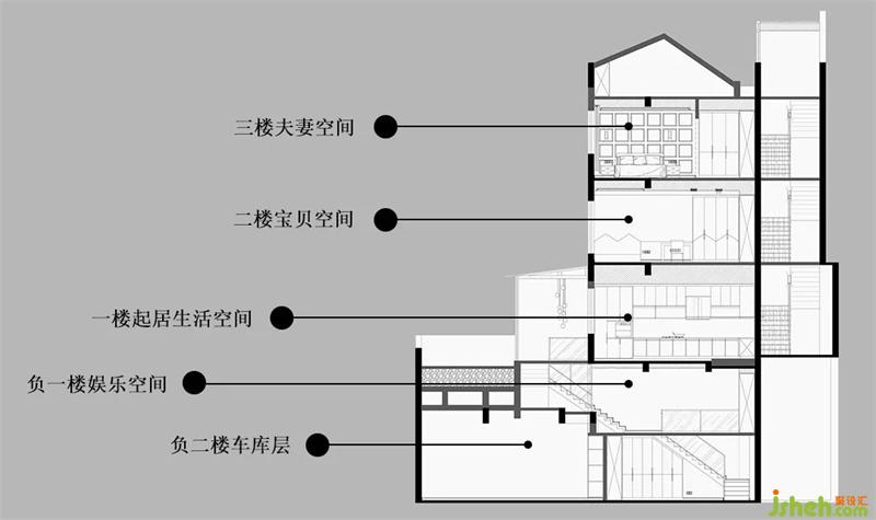 3) 一楼是起居生活空间,二楼三楼分别为宝贝及夫妻俩的私密休息空间。