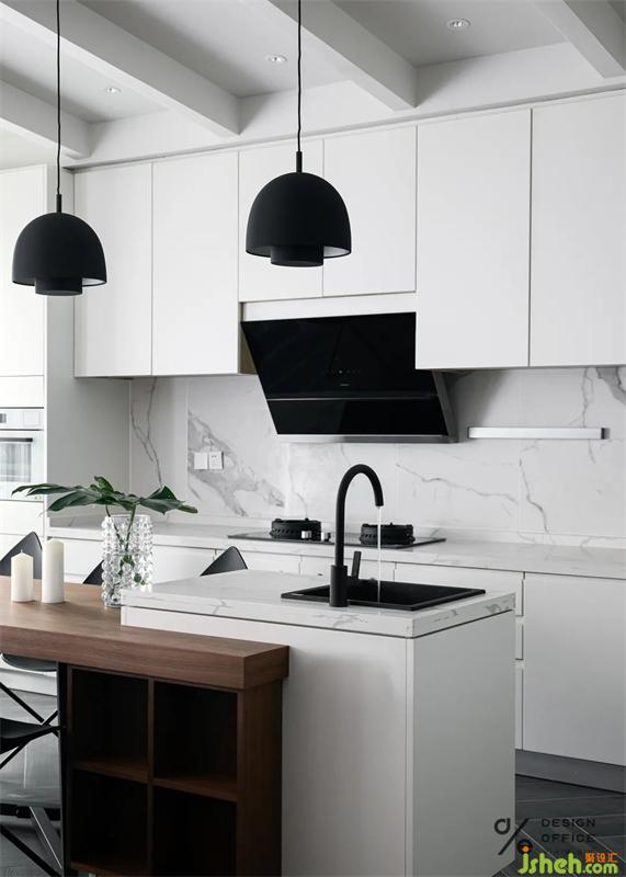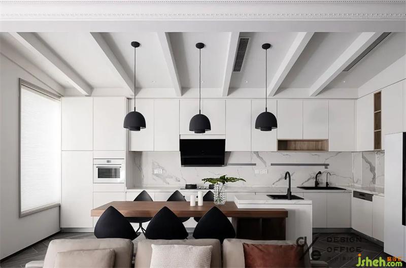 餐厅层高采用了假梁的处理方式,既保证了客餐厅的高度,又让厨房定制的柜体与顶面无缝衔接起来。