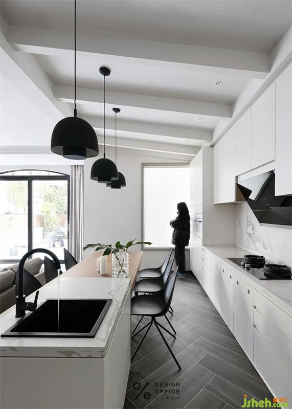 重庆别墅装饰把客厅、开放式厨房整合到一个视觉空间里面,各个空间形成整体感又拉近了动线,给予餐厅空间更多的可能性。