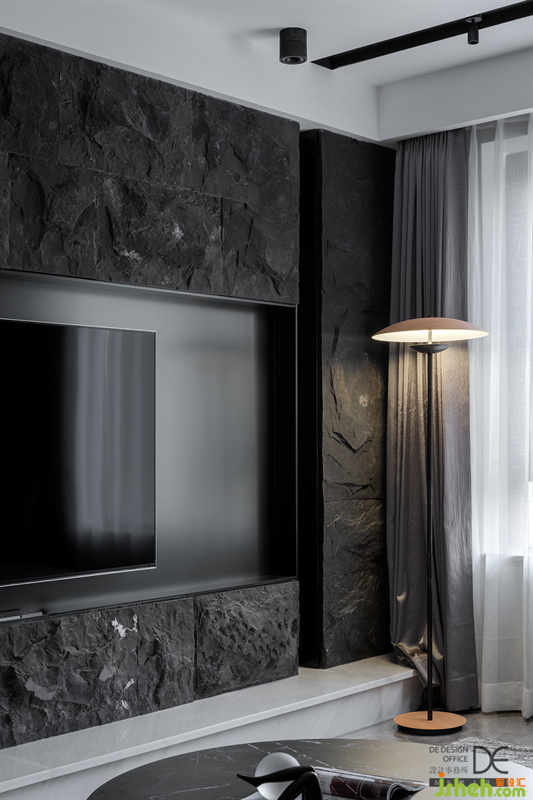 电视背景墙的材质肌理感,呈现出自然的美感,温馨的落地灯让硬朗的石材也变得柔和。