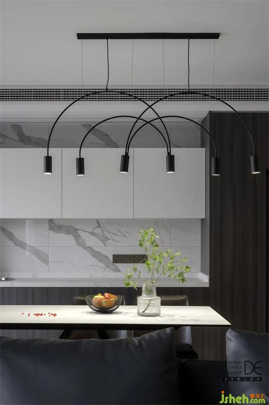 材质上沿用统一的深木纹色为主,辅以鱼肚白的墙砖和肤面柔和的白色吊柜来调和深色,简洁的餐桌、皮质的餐椅、温馨的局部灯光,家该有的质感和温馨得以展现。