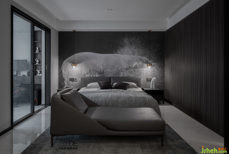 主卧的整体色调采用远比公共区域的色调深,大面积的艺术墙布和深木纹的饰面,让空间更显静谧稳重。