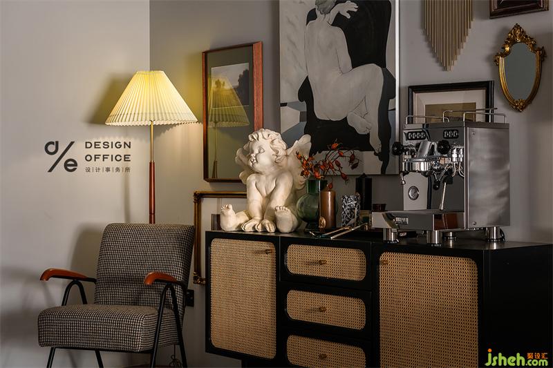空间整体看似随意,事实上所有物件的摆设都是业主用心设计布置,呈现出戏剧化的艺术魅力。小天使雕塑、中古的小家具、富有韵味的器物饰品与略带复古的情节,在空间中演绎着活泼生动的合奏。