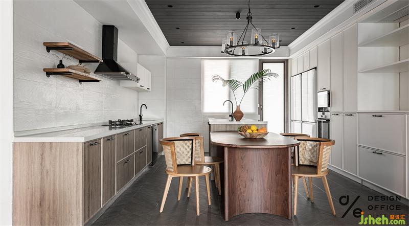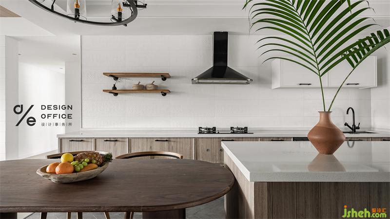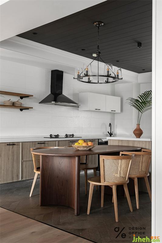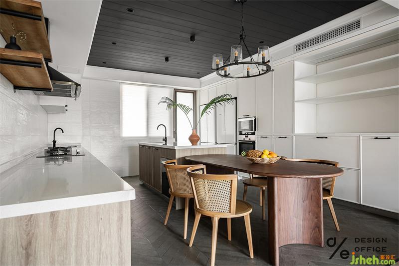餐桌一侧,打造了整面橱柜,既满足日常储物所需,又清新巧妙。