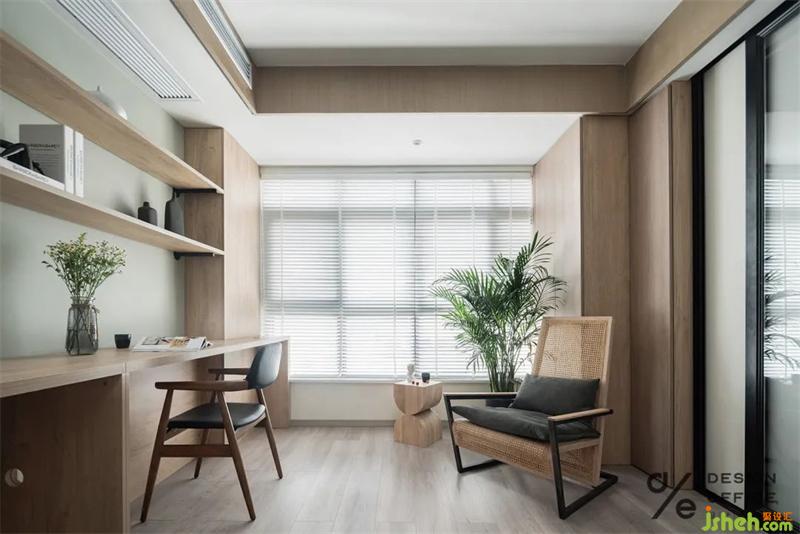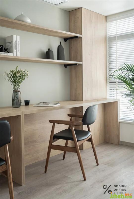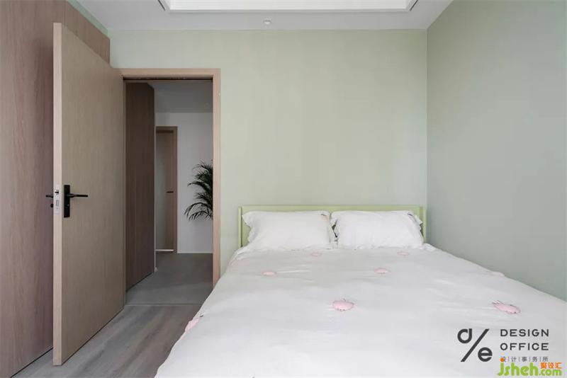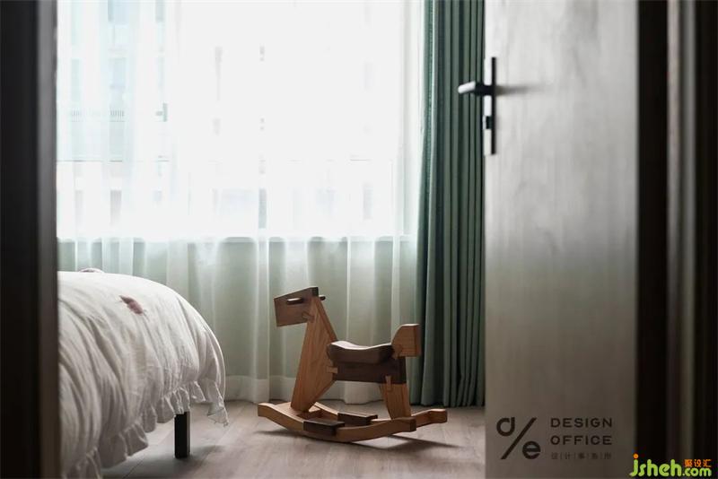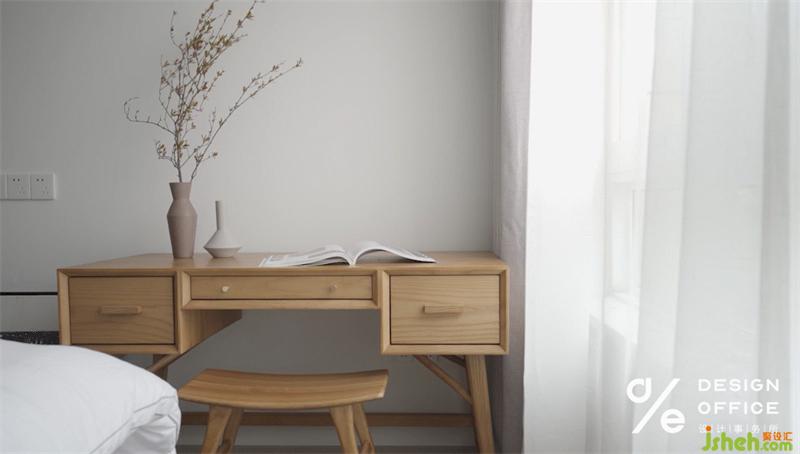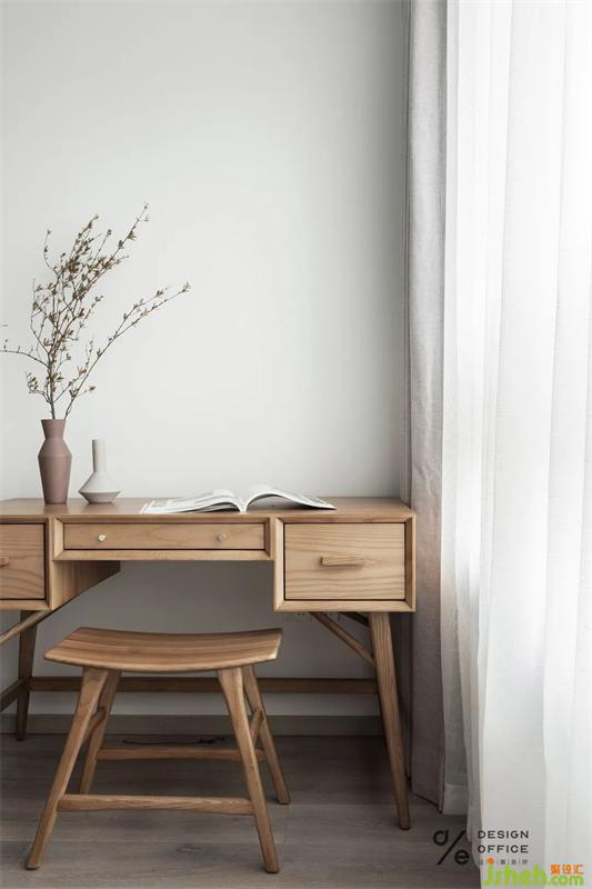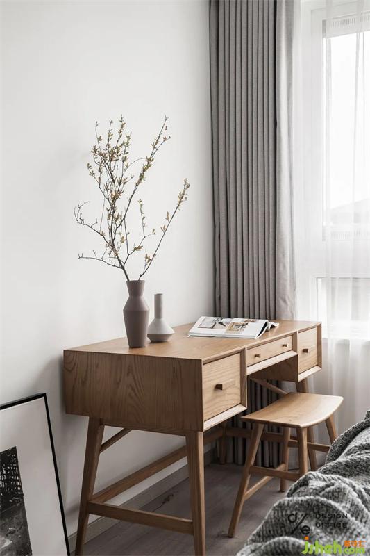 棉麻感的窗帘和床品呼应,柔和白色的单调。房间角落的桌面与衣柜做了融合,添上一张椅,又多了一处安静的庇护所。