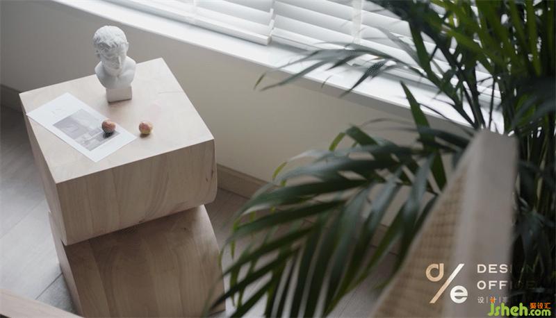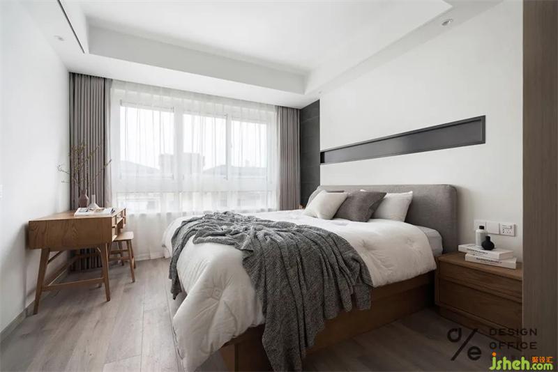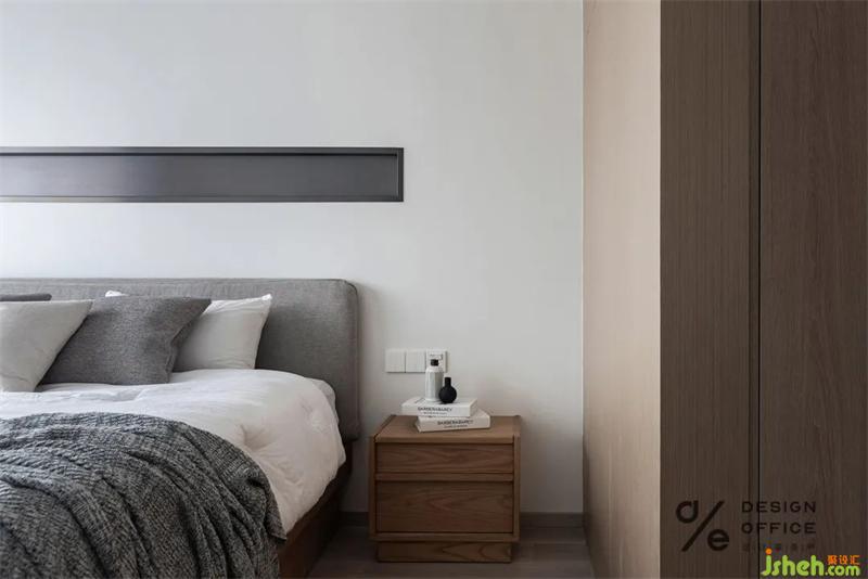 卧室墙面是干净的素白,深木色的床与边柜加以点缀,中和白色的轻盈。