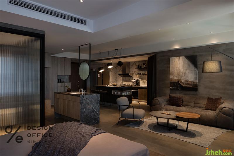 本案是一套建筑面积为90m²的小三居,屋主是位独居的男性,年轻时髦有想法。他认可设计师的设计理念——人是居住空间设计的出发点与终点,希望自己的家是现代的、可以适应快节奏的生活,设计师基于此,把整个空间结构全部展开,不去过多划分区域功能。重庆家居设计了客厅餐厅书房共处一室的格局,整个空间高级简洁,90平米的面积根据屋主的实际使用需求规划了一间简单的卧室,将空间释放给公区。
