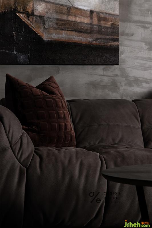 客厅似剧场,黑与灰的基底使本就宽敞的待客空间更显内涵品味。沙发姿态低矮,坐与卧都慵懒,碳素圆几加进两分柔和,拿与取更自在。