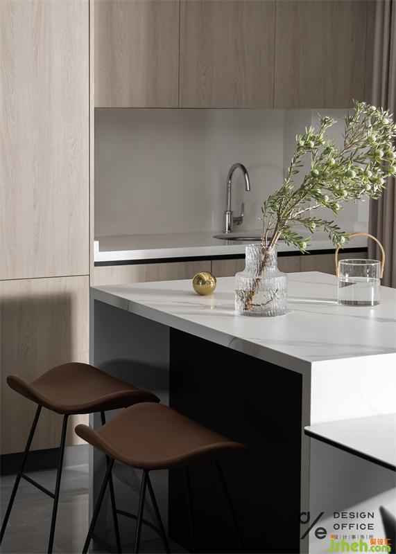 厨房的采光及通风更好的与客厅相互对流,西厨背后是一个带有水盆的吧台,使用上,我们转身的操作会更顺手,水盆也能将有油的盆和洗水果杯子的盆进行区分,更加干净卫生。
