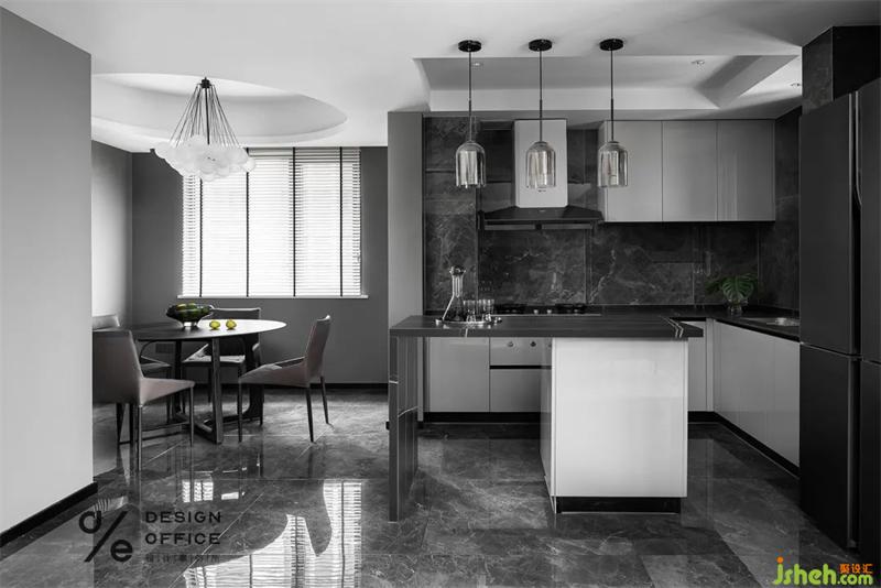 整体格局紧凑,厨房面积较小;拆除厨房墙体,根据业主要求做成开放式厨房;增设岛台,弥补操作台的不足。