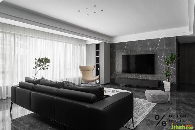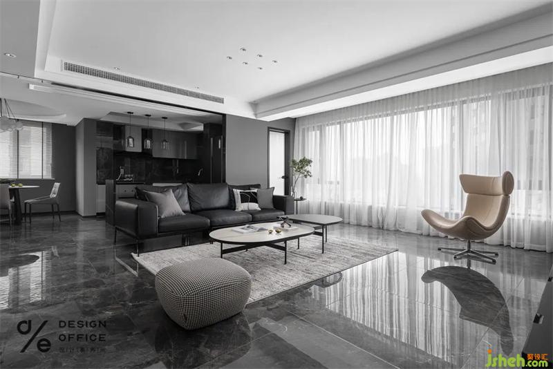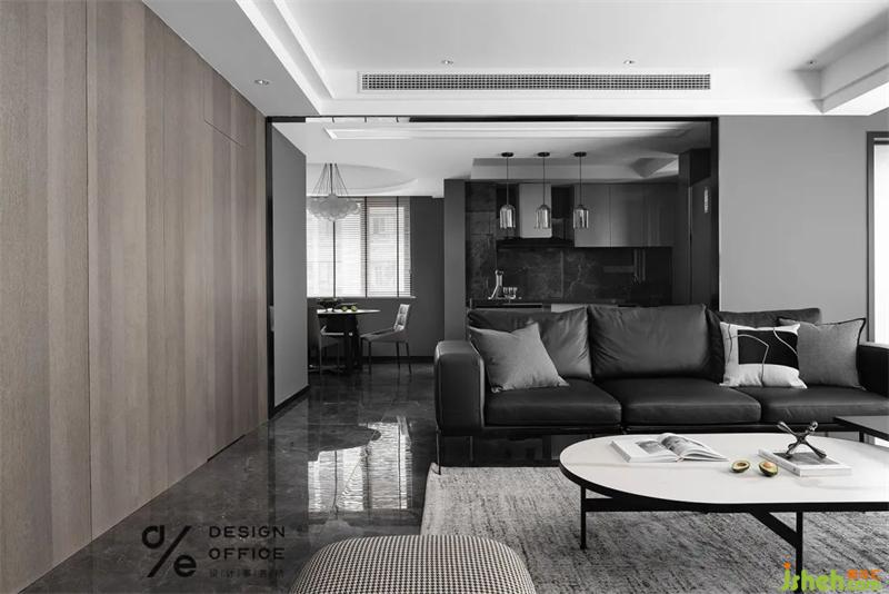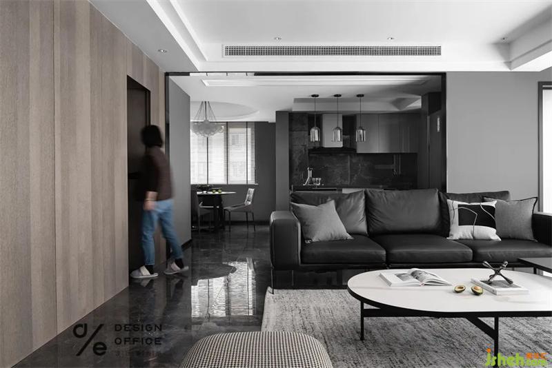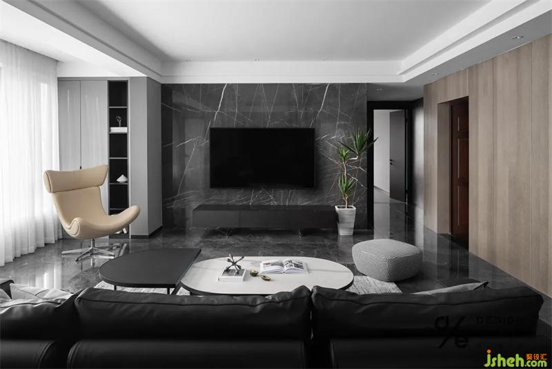 客厅采用无主灯照明,见光不见灯的设计是对于人最舒适的顾及;黑白的主色,是干净纯粹的色调;没有过多的装饰,只是将木色和灰色穿插在空间中。