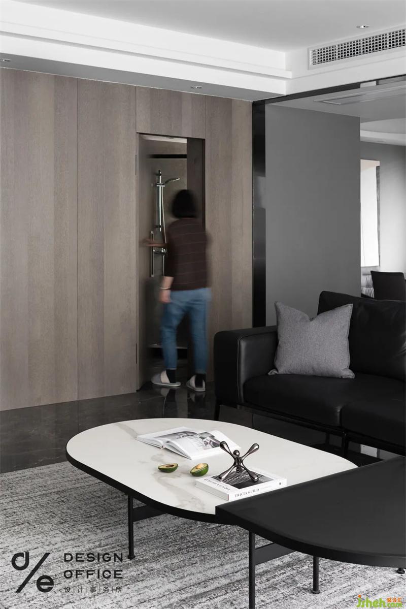 客厅与次卫生间的连接采用隐形门,采用木饰面的设计;在不影响空间的整体布置前提上,将门+木饰面组合,设计成隐形门,让空间显得更加舒适自然。