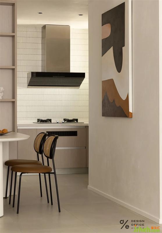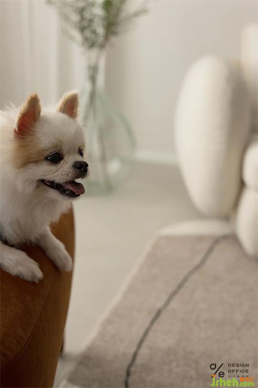 整个软装色彩搭配,餐椅和单椅同色系的选择,在奶色系上加了一些撞色,是整个空间统一而又有乐趣。简约而又不失趣味,增加了空间视觉灵动感。