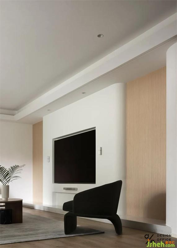 家居设计客厅局部,弧形突出的电视墙结合木饰面造型。深色单椅,加上现代造型落地灯,仿佛诉说着空间的故事......