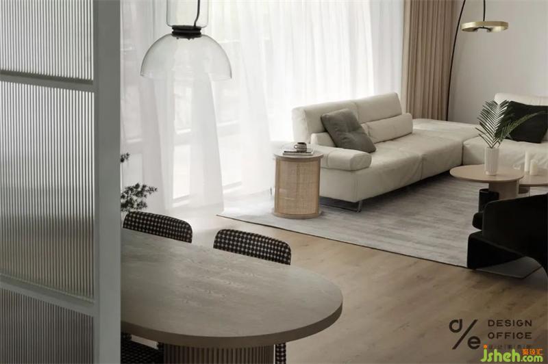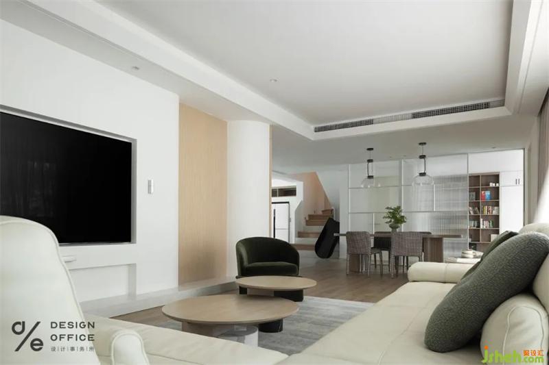 日光和软装铺陈的温暖,让阳光成为了空间的主角。明亮是空间主轴,木地板和木饰面搭配白色背景,在白天光线充足时烘托室内氛围,配上奶油色系沙发,形塑出客厅的醇厚气息。