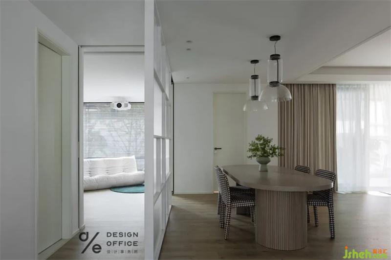 把门关上,投影幕布放下来,用专业级投影仪播放电影的时候,这里就是一个影音室;当朋友需要留宿时,放下折叠床,将两扇门关上,这里就变成了客房;而平时,多功能房两扇隐藏式滑门藏着的时候,餐厅和多功能房之间就只有一块玻璃隔断,这里也就成了一个开放式书房。