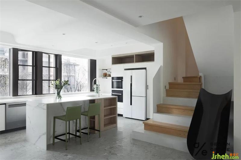 大餐桌是一日三餐和家人聊天的好去处,相邻的是用玻璃隔断的多功能室;而另一边就是超大的开放式厨房,是烹饪美食的地方,也是早晨用餐和喝咖啡的绝佳之地。