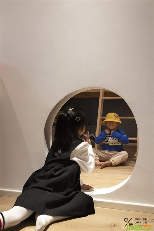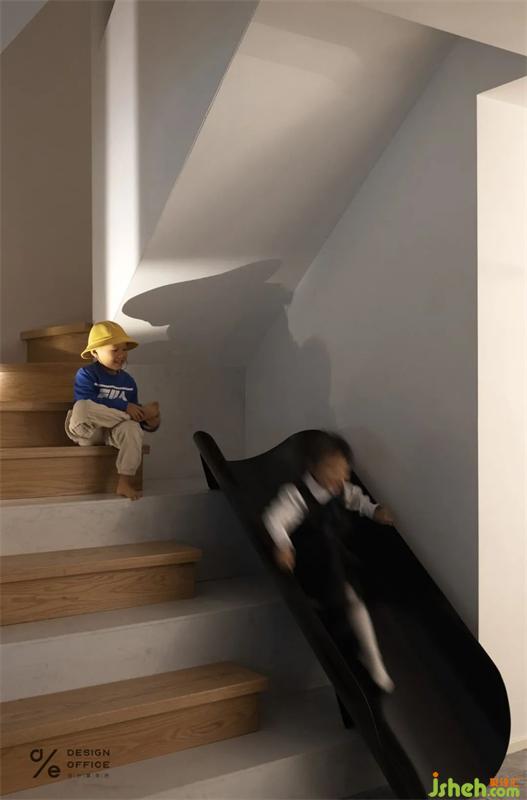 阶梯与滑梯同在的设计,也是设计师送给孩子们的礼物。设计师参考了游乐场的一些设施,还设置了一根到底的柱子,让小朋友在攀爬的过程中有东西可以抱着旋转,保证了玩耍的安全,这里已然是姐弟俩的小小游乐场。