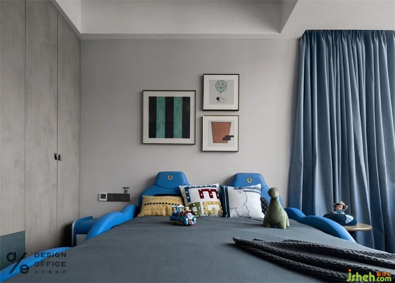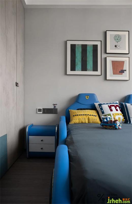 淡灰纹理和蓝色撞色的衣柜,童真有趣的装饰画,孩子喜欢的汽车造型的床,使整个房间呈现出少年童真感的同时,也不乏硬朗气。