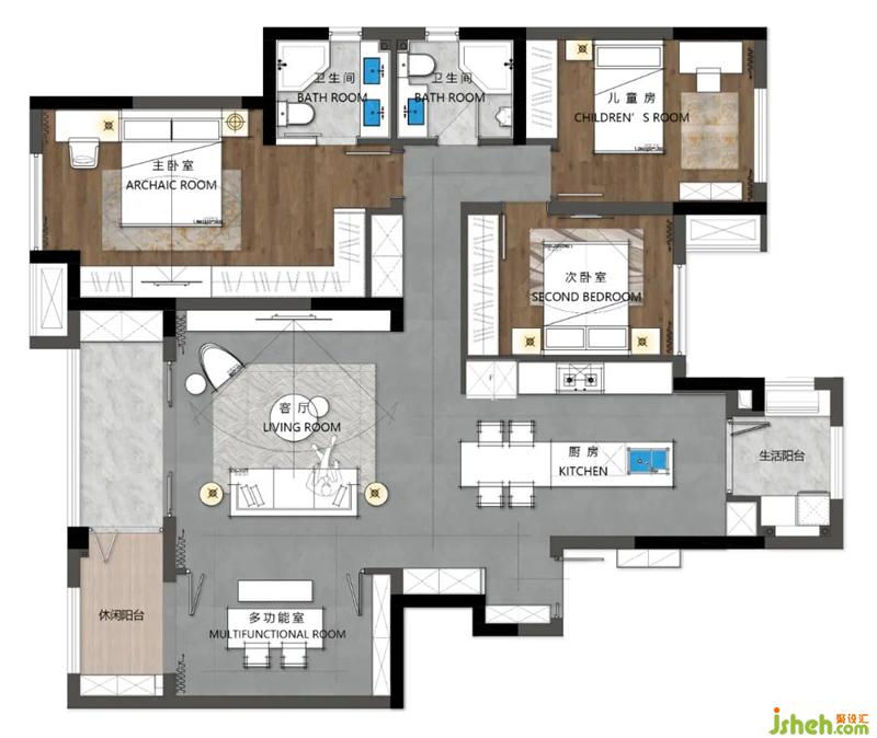 1. 厨房空间略小,即使做开放式也不能完全展开,设计师借用了长辈房的部分空间,来扩大厨房区域,增加开放式厨房的社交属性。