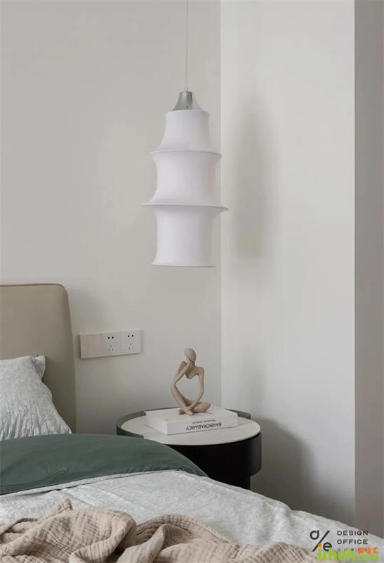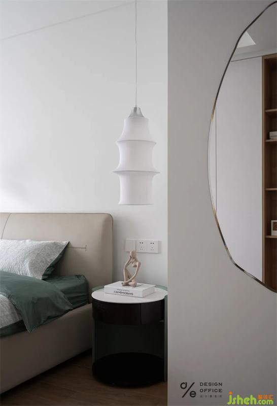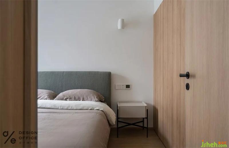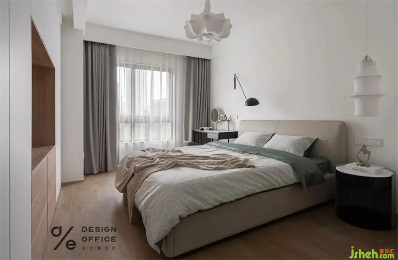 主卧室的装修设计同样走简洁路线,干净的色调更显空间的温馨。即使没有配套的衣帽间,有了设计师在床尾设置的一整壁柜子,同样也能满足业主的收纳需求。