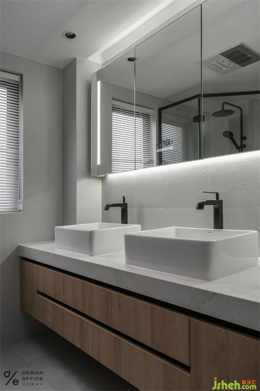 卫生间都选用了亚光处理的材质,瓷砖的竖向贴法,增加空间的延展性。主卫使用了大长条浴室柜,增加利用率,也有了更多的储藏空间。