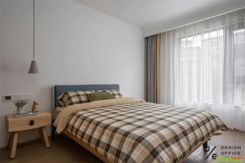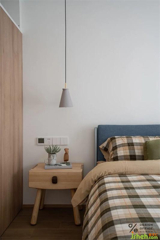儿童房没有太多童稚化的设计痕迹,窗帘、床品等都与原木色相呼应。只是床头的动物摆件点明了空间属性,格子床品更是无形中为整个空间带来了更多的活泼意味。