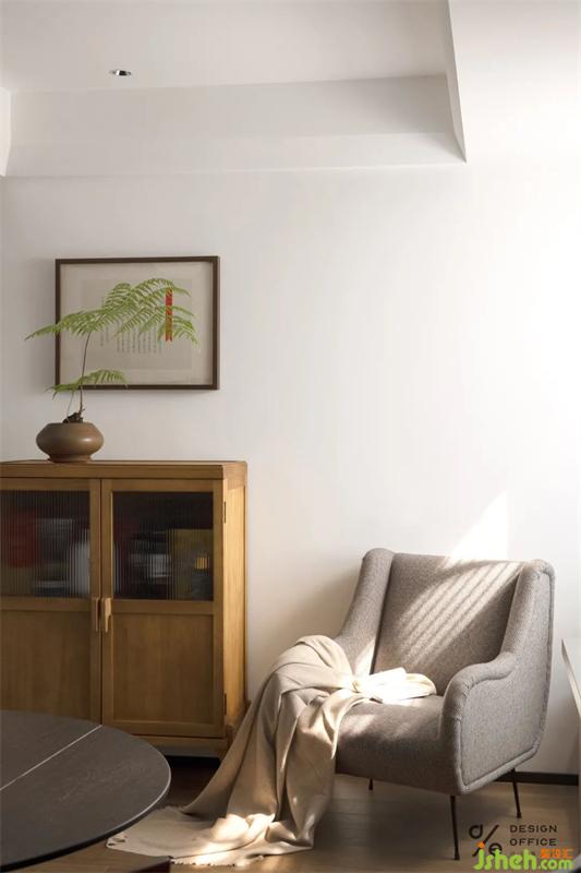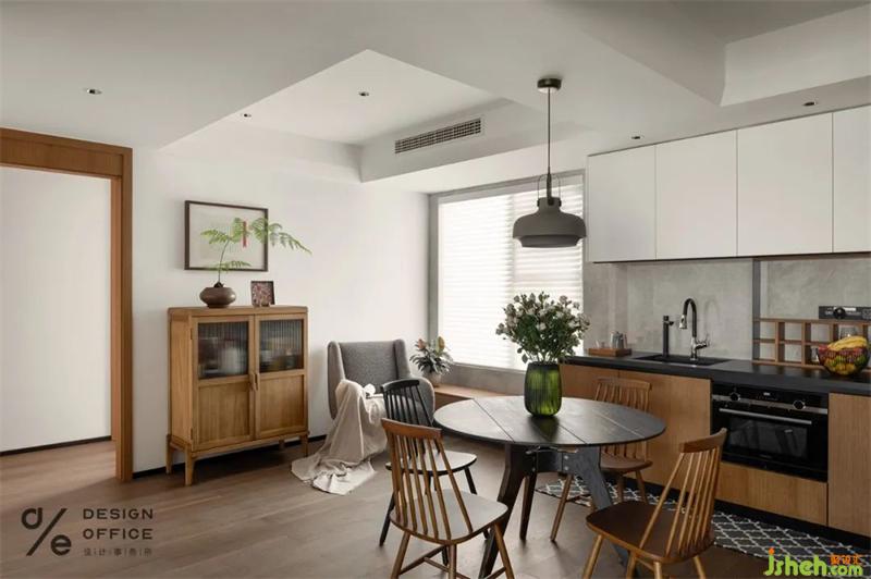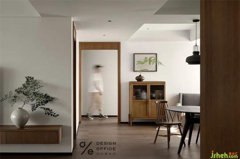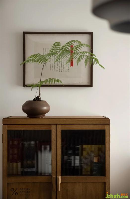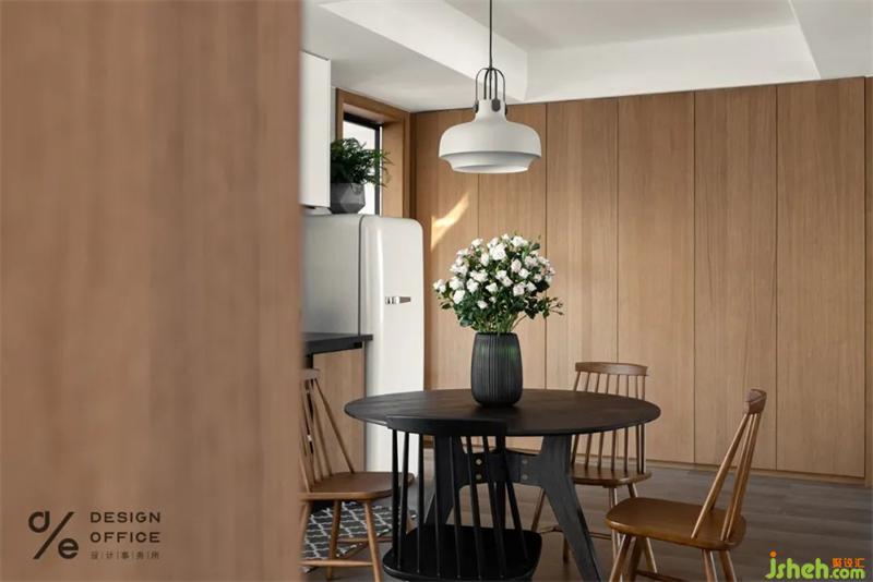 餐厅大量的木质元素,吸引着主要通道的目光,聚焦属于餐桌上的精致美味,餐边柜上摆上绿植,自然的气息偷偷融进生活。