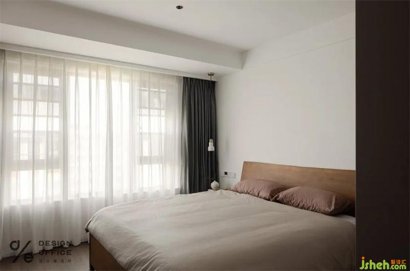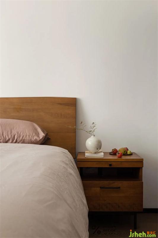 把公区自然舒适的状态延续到卧室当中,墙面没有做过多的修饰,更多去关注的是生活化的一些场景。所以选用了跟公区风格一致的原木床,搭配素色床品,充满韵律感,细腻而耐看。