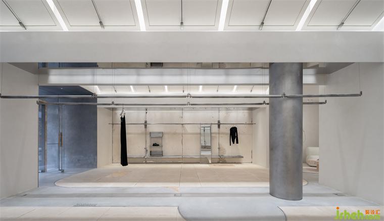 中场区域,展厅设计以缝纫机的穿插交织为设计灵感,引入两两一组的悬挂系统,满足于 1200mm– 2400mm区间内不同高度的调节,适配品牌不同季时装展示的需求。