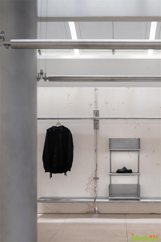肌理是空间的情绪。大面积的白,挣脱规则的束缚,赋予了更多自由的想象。手工雕琢的虫洞石墙面如大自然的笔触,看似随意,却在靠近时轻而易举地牵动着细微情愫。每一件服饰有如独立的艺术品,给予来访者足够的空间观赏。