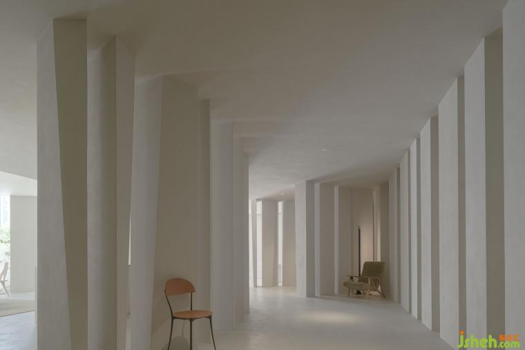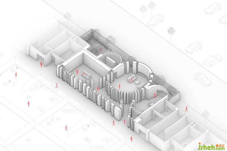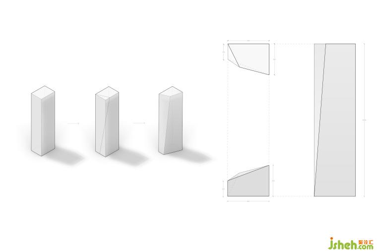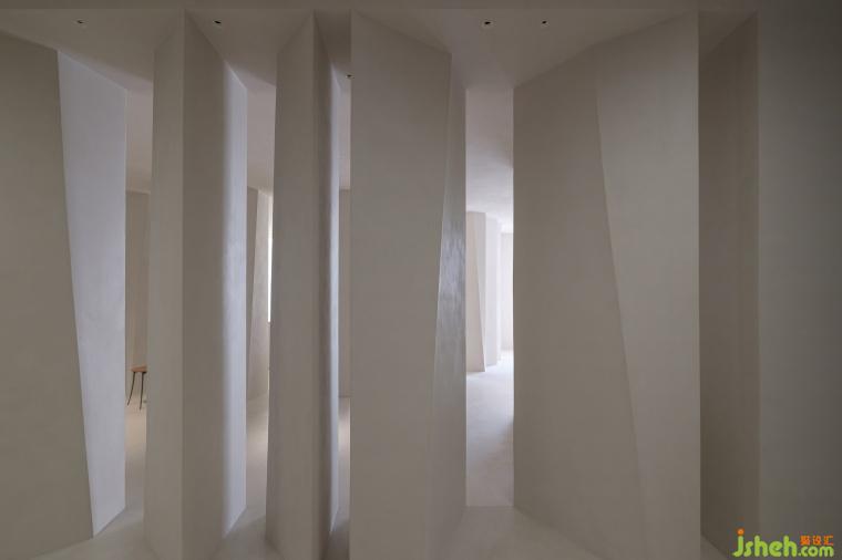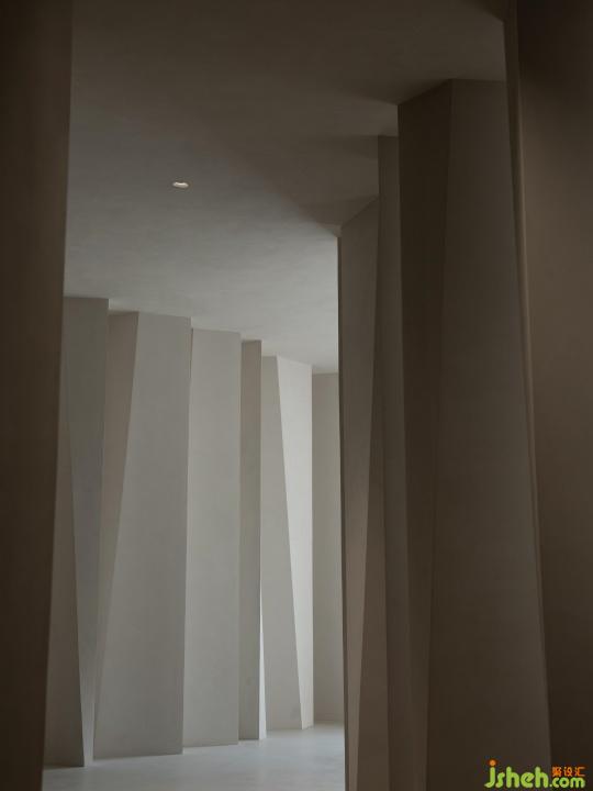 基地现况有四根1米左右宽的大柱子,这些功能性柱子不仅影响参观动线,更阻扰空间视觉轴线。HAS design and research建筑事务所主持建筑师Jenchieh Hung与Kulthida Songkittipakdee延续安徽特有的石林景观,保留场地既存的大柱子,并根据现有的柱子尺寸进行“形变”后,创造大片有如安徽当地特有的石林空间。在白天,近100根的石林以不同倾斜角度结合太阳光,让参访者在高密度城市中仍可体验到一股自然性空间;到了夜晚,舒适的季节风穿越具有孔隙的石林,让参访者在繁忙工作后仍可感受到宁静且具仪式感的柱列空间。