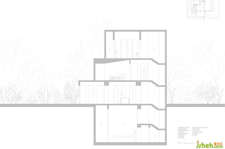在森之墅所创造的空间,是一种基于对自然的敬畏与类比,让建筑学习森林般的自然生长,像是序列的柱子有如树丛,每一根柱子肌理都有著独特的纹路,以及相异的比例尺寸,呈现具有视觉与触觉的体验。其细部设计也是这个项目的特色,透过玻璃与柱子的关系,强化建筑与空间的整合。而整个建筑从外部到内部,给参访者一种纯粹又高雅的氛围。乍看之下这是一个很极简的设计项目,但实际上,Hung And Songkittipakdee(HAS)把所有建筑常用的设备精细的隐藏在柱子中,包括消防设备、电线、水管、机电、空调等,让建筑空间从而简单化,并且让人感知场地与外部城市截然不同的气氛。此外,景观也是该项目的一个特点,它不仅出现在首层森林庭院,更蔓延至地下二层的天光庭院,和三层主卧室外的水雾花园,提供各种昆虫与鸟类伫留,带来具有嗅觉与听觉的生活体验。这个房子不只是住宅,Hung And Songkittipakdee(HAS)创造可持续生长且无时间性的场所,它带来一种强烈的仪式感与神秘性,替当代住宅注入另种精神象徵。