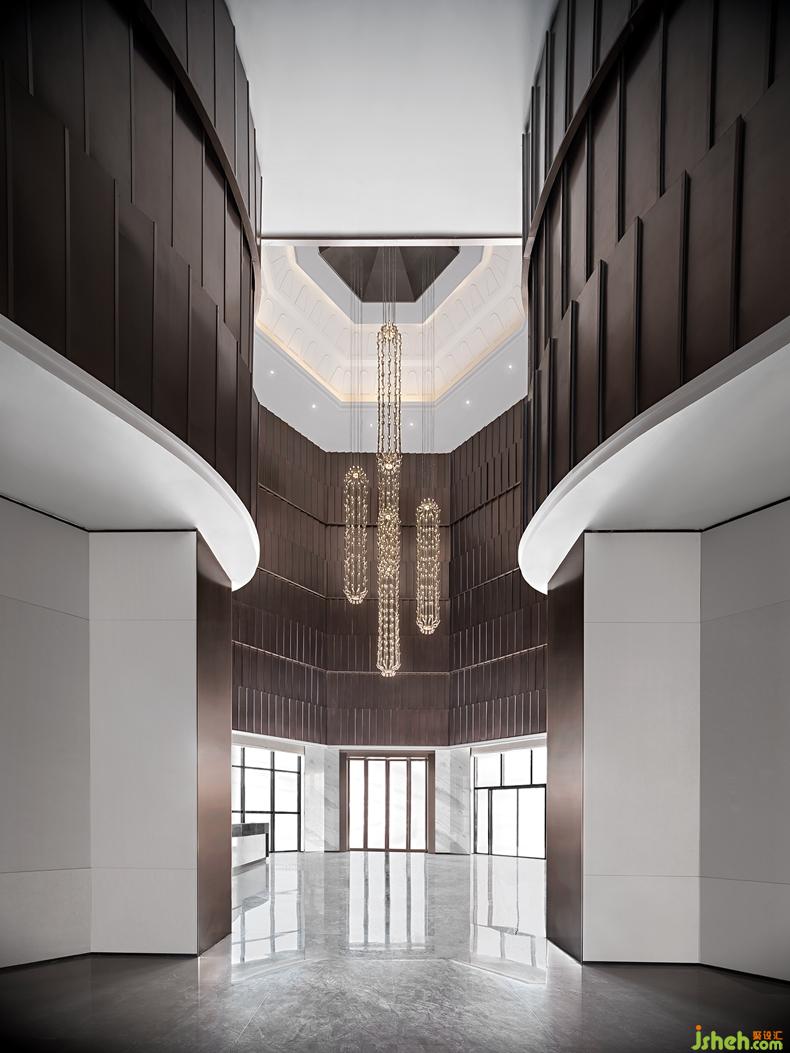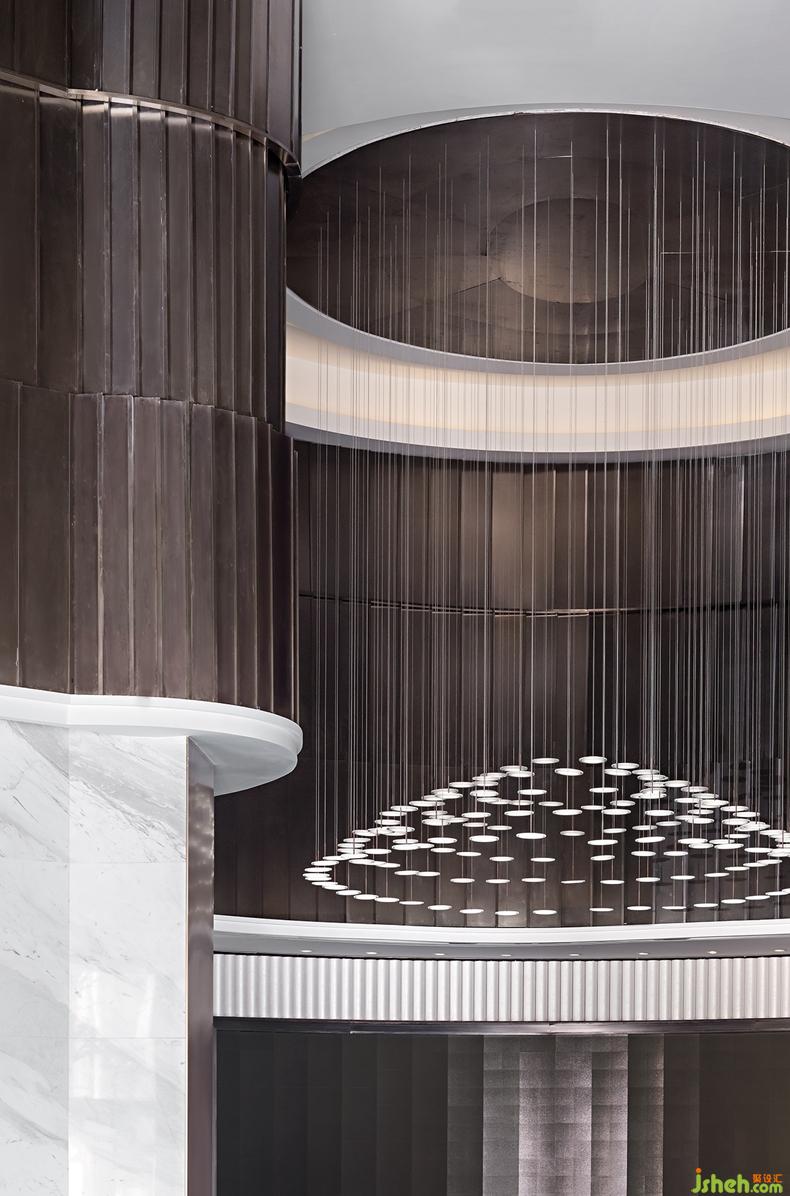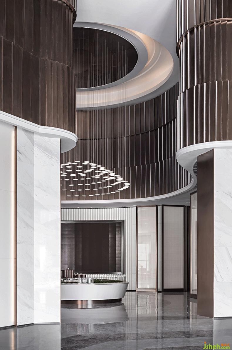 由于前厅处于圆顶建筑内部,其层高16米带来的空旷感需要适当的室内表皮装饰来调整舒适的视觉比例与空间尺度,带来充裕感知上的磅礴气势,整体空间本身不再属于某种艺术风格非此即彼的制式描述,而是通过材质的流线造型与色彩的魅力结合,让空间引人入胜。深圳装修公司