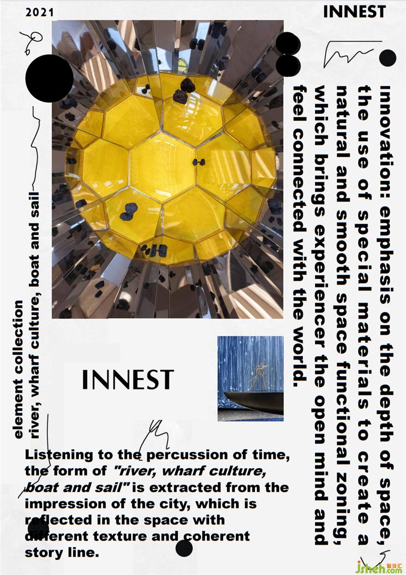 通过不同方式被感知构想,每个元素都简单性发光。在设计中,尝试将光华流转的江水、车水马龙的码头文化,通过设计的转译,将现代的简与艺术的雅融汇一体,令历史的光影和现代的升华结于一庭。